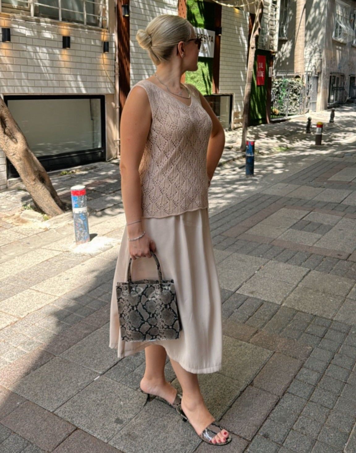 Doğal ve ipeksi Bamora ipliğiyle örülen bu krem rengi bluz, hafifliği ve nefes alabilir dokusuyla gardırobunuzun favorisi olmaya aday.
