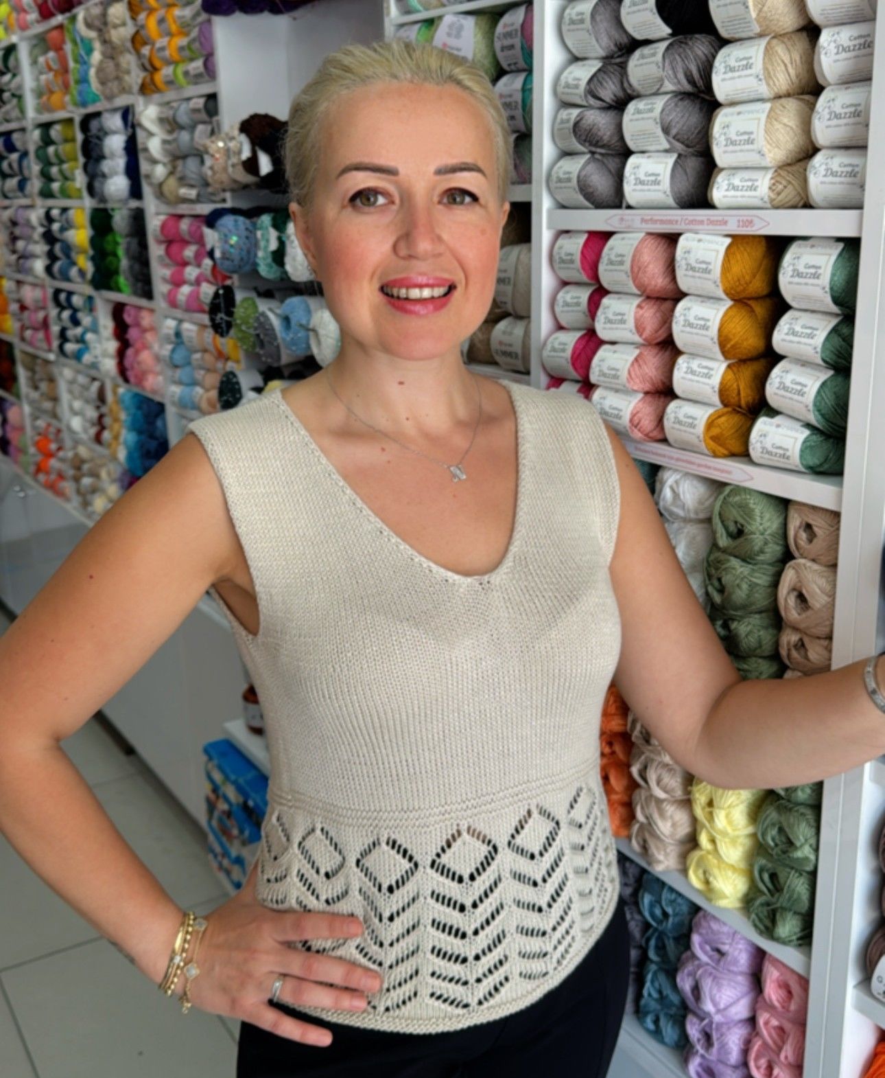%100 bambu içeriğiyle üretilen Nevel Bamora ipliğiyle örülen Bamora Luna Bluz, ajurlu alt detayı ve geniş omuz askılarıyla zarif ve ferah bir yaz parçasıdır. Krem rengiyle sade ama şık bir görünüm sunar. Doğal yapısı sayesinde cildinize yumuşacık dokunur, nefes alır ve serin tutar.