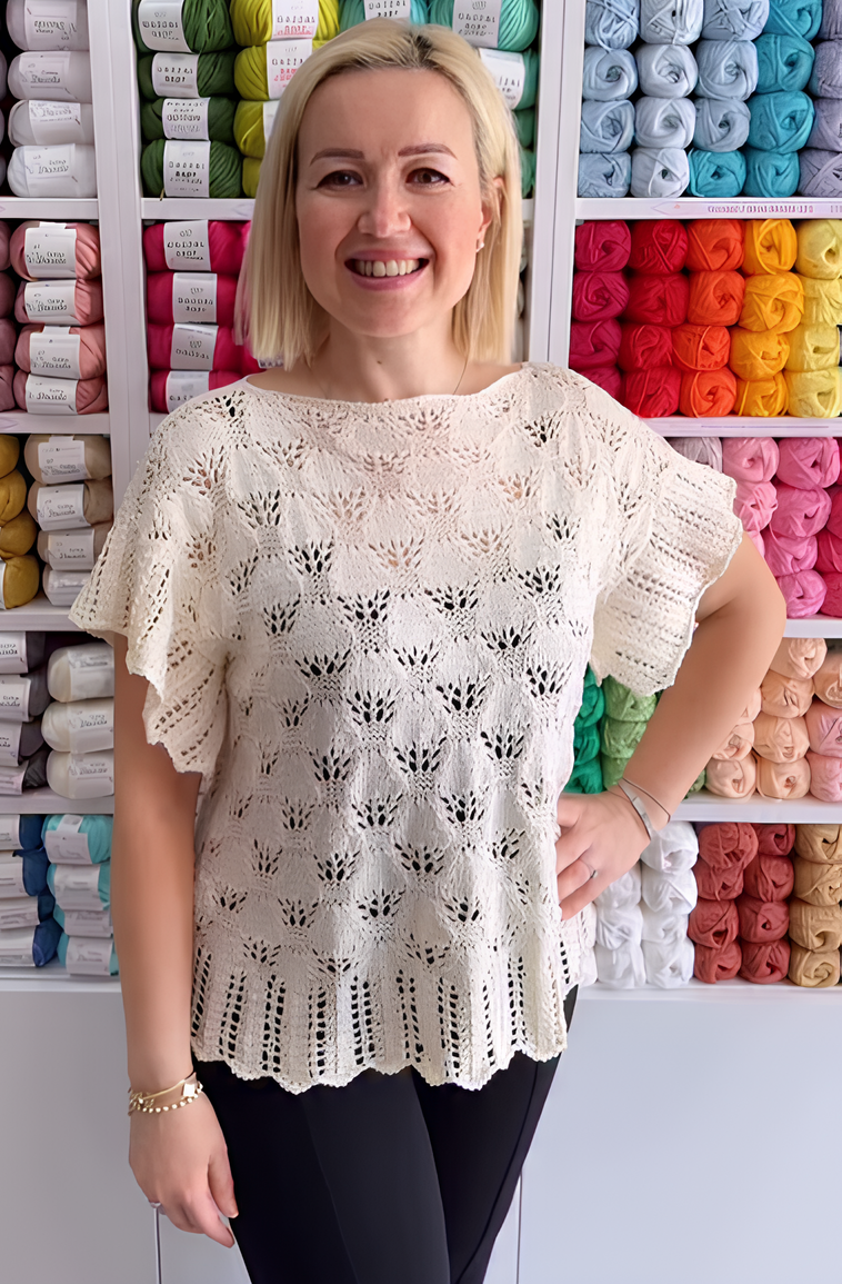 Zarafeti ve ışıltıyı buluşturan bu bluz, Performance Cotton Dazzle ipiyle örülmektedir.