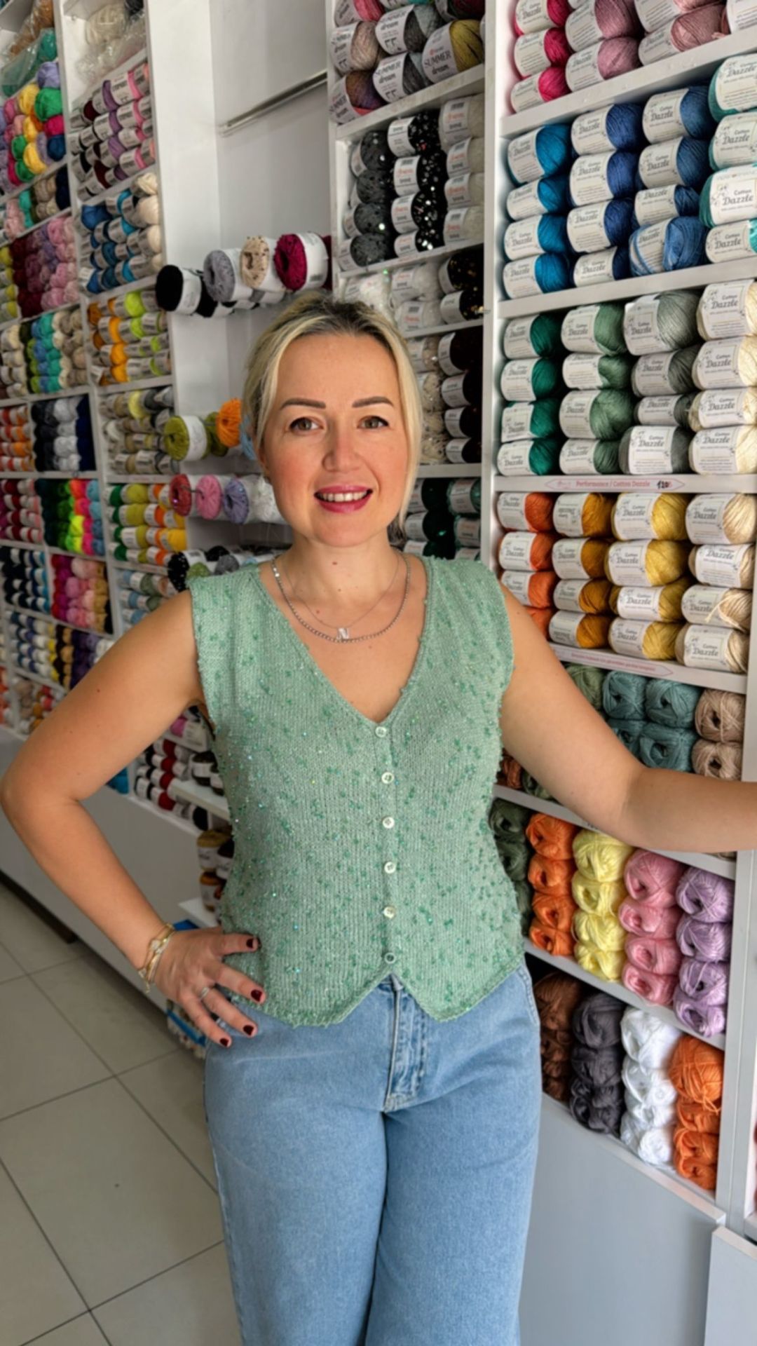 Mint yeşilinin huzur veren tonunu, Nevel Diamond ipliğinin doğal ışıltısıyla bir araya getirdik. Sonuç: Hafif, dökümlü ve yaz günlerine yakışır bir yelek.