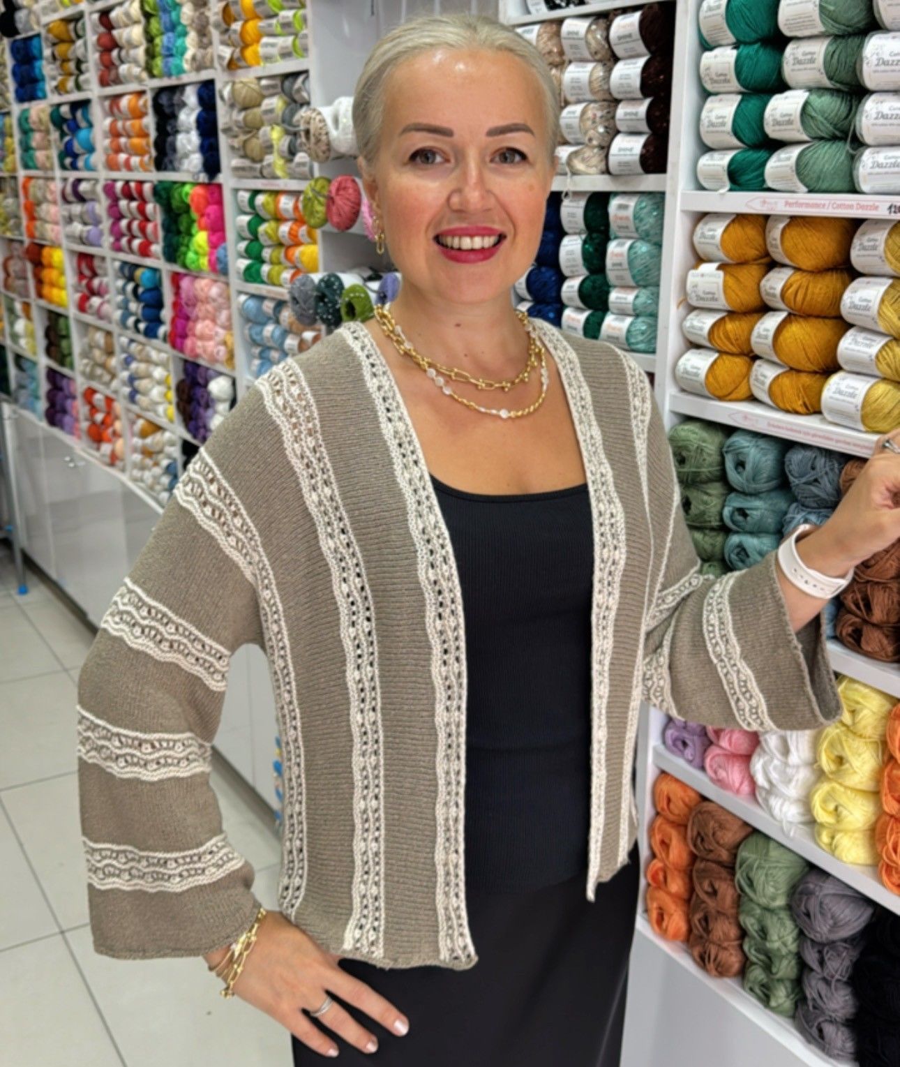El emeğini modern bir şıklıkla buluşturan bu özel bluz, zarif tasarımıyla dolabınızın favori parçalarından biri olacak. Örgüde sadelik ve asaleti sevenler için tasarlanan modelde, iki farklı Lenora rengi kullanılarak şık bir kontrast elde edildi.